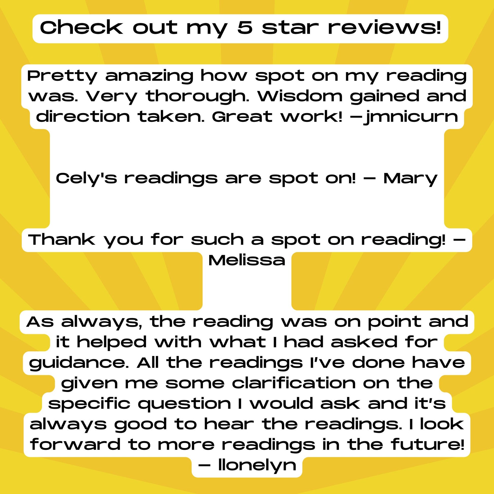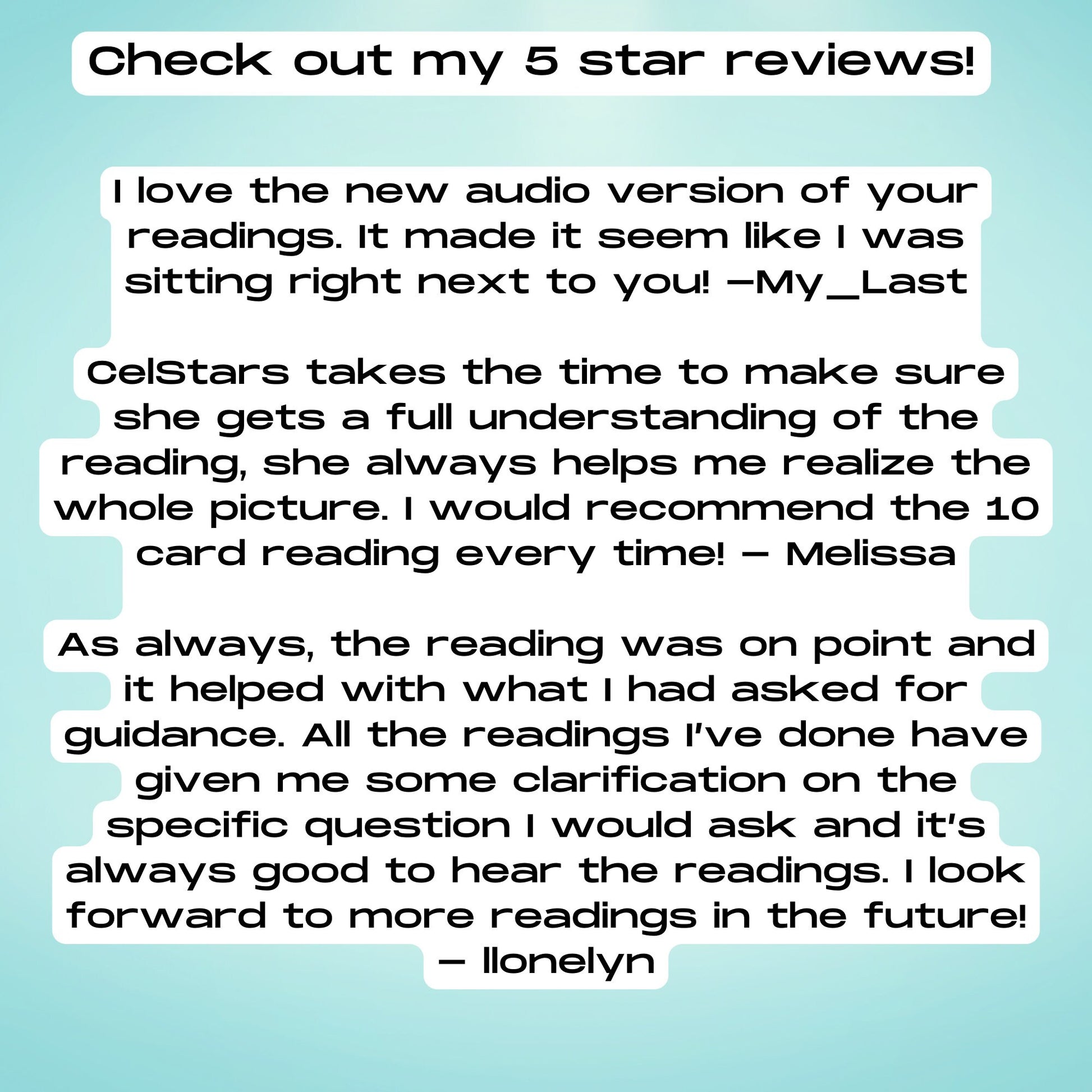 ***Readings are only meant to serve as a guide for situations and concerns. They are in no way a replacement for your own judgement or professional advice. I am not a divorce lawyer, therapist, fortune teller, or spirit medium. I do my best to give you all the information I receive from the cards. Also, please have an open mind when purchasing a reading. Sometimes we may hear messages that we weren't expecting to hear. This does not mean your reading was inaccurate. If you need clarification on anything, please contact me through your Etsy Convos so we can communicate! Happy customers are my utmost priority. Let's chat!