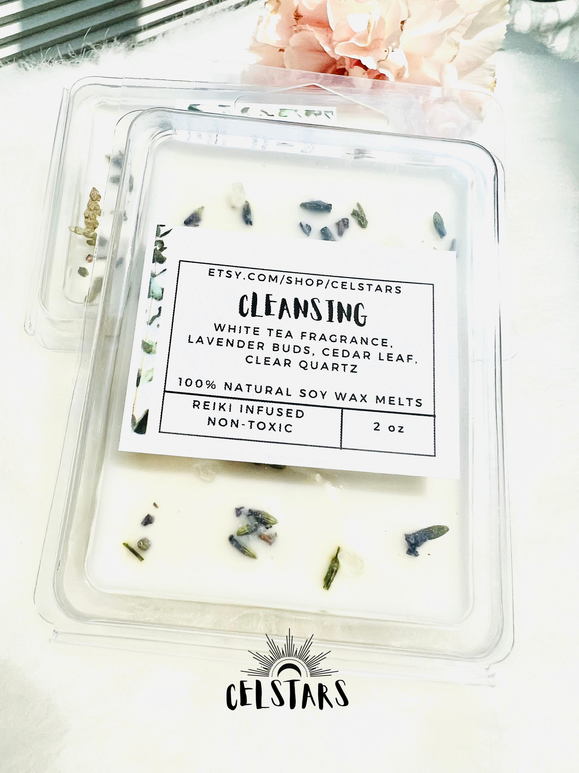 "Cleansing" is created with a fragrance reminiscent of White Tea, perfect for purifying and balancing energy into your space! These wax melts are also topped with lavender buds, cedar leaf and real quartz crystals for extra herb and crystal energy! Finally, these melts were blasted with Reiki by me, a Reiki master and instructor.
