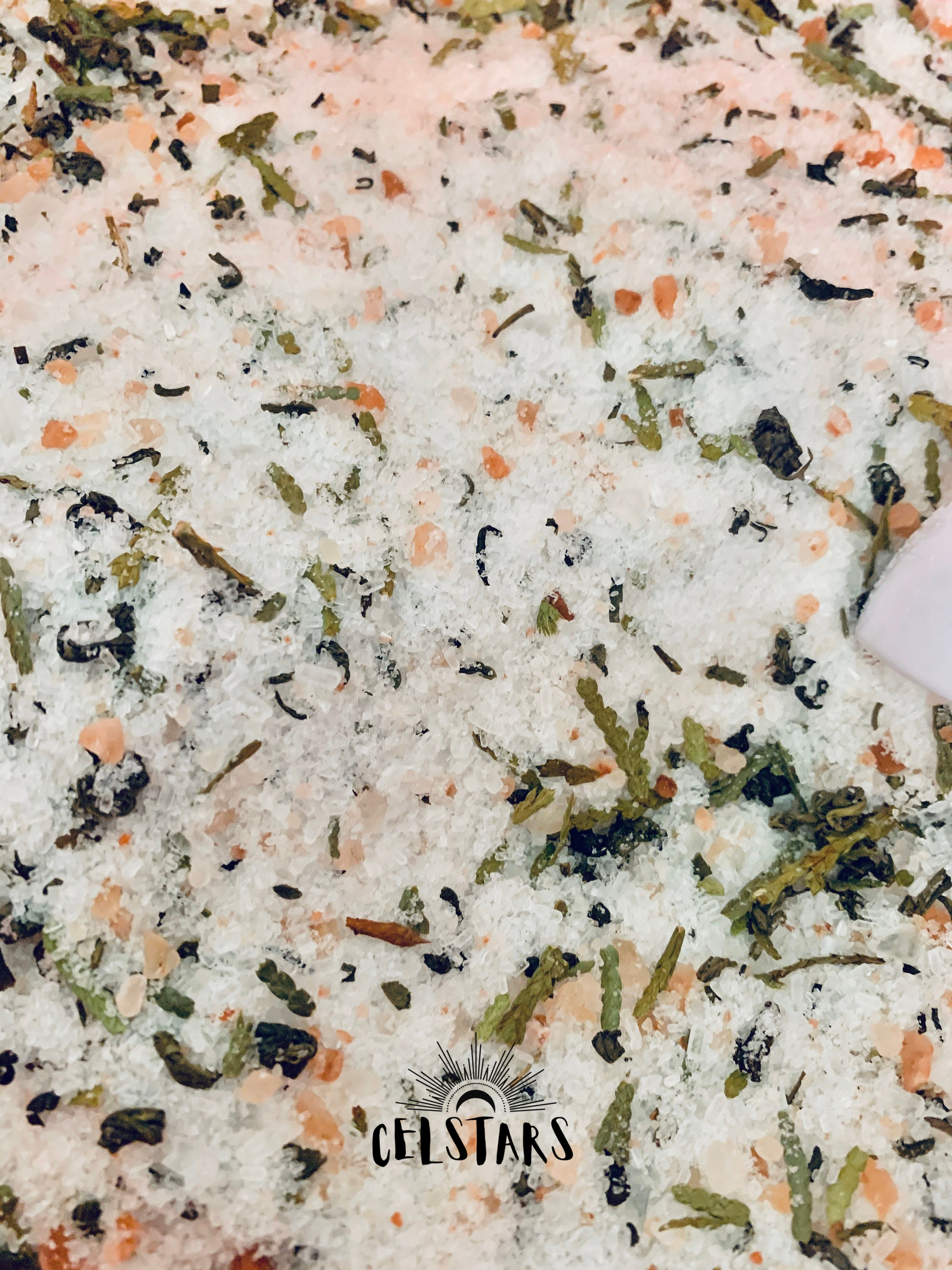 Ingredients: Epsom salt, Pink himalayan salt, dendritic salt, cedar leaf, green tea leaves, frankincense essential oil, rosemary essential oil, lime essential oil, clear quartz crystal