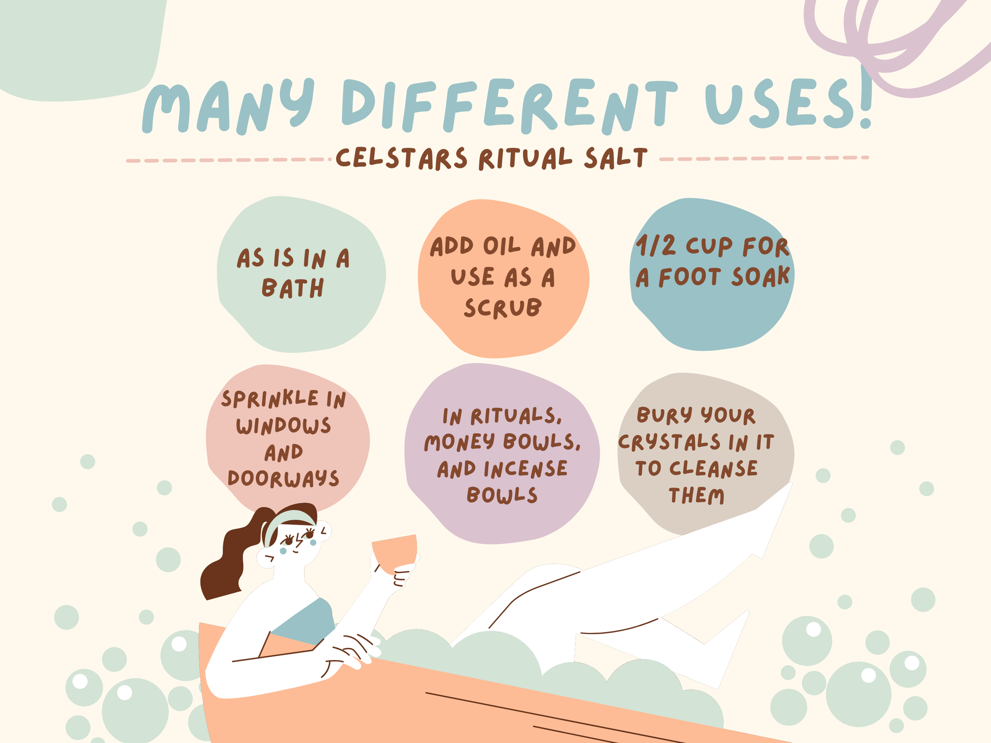 So many uses! Use it as is in a bath, as a foot soak, a scrub, incense holder, sprinkle in in windowsills and doorways, in your shower, and so much more.