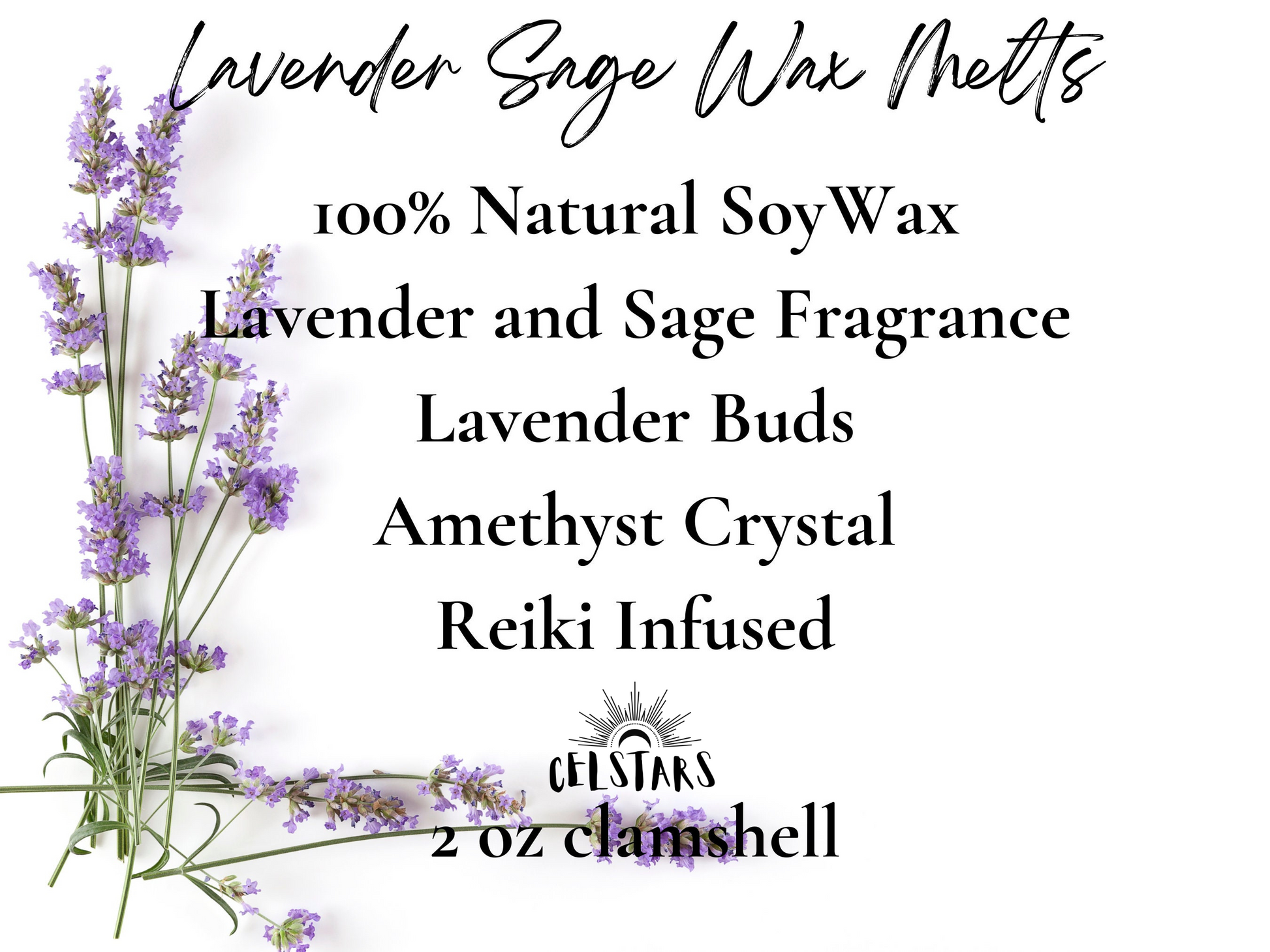 "Lavender Sage" is created with a fragrance reminiscent of Lavender Flowers and Sage, perfect for adding protection, cleansing energy, joy, and peace into your space! These wax melts are also topped with lavender buds and real amethyst crystals for extra herb and crystal energy! Finally, these melts were blasted with Reiki by me, a Reiki master and instructor.