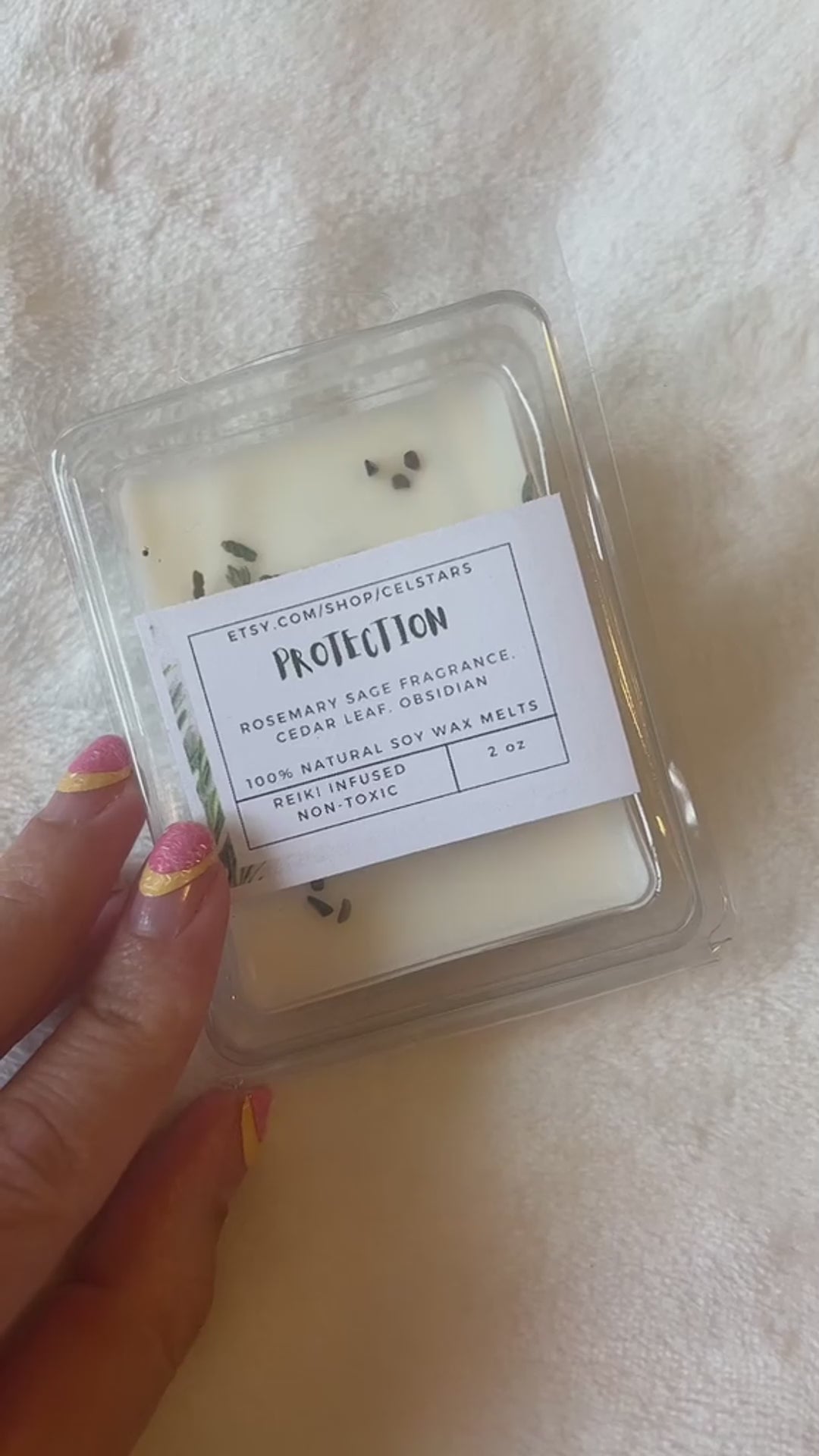 "Protection" is created with a fragrance reminiscent of Rosemary and Sage, great for adding cleansing protective energy into your space! These wax melts are also topped with cedar leaf and real obsidian crystals for extra herb and crystal energy! Finally, these melts were blasted with Reiki by me, a Reiki master and instructor.